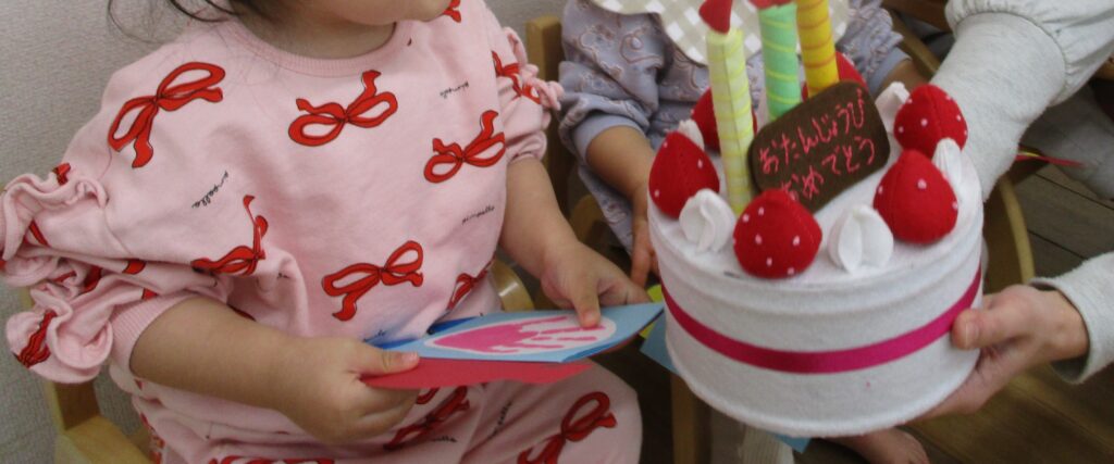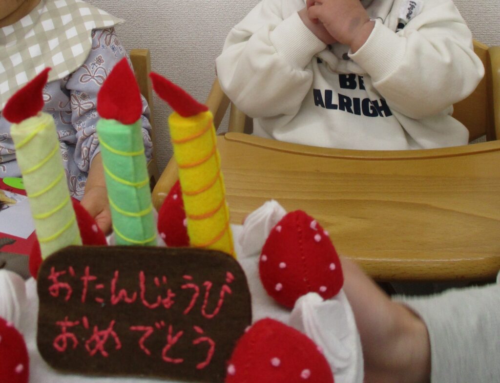 0歳児さん1人、1歳児さん2人のお友だちが今月お誕生日を迎えました!!